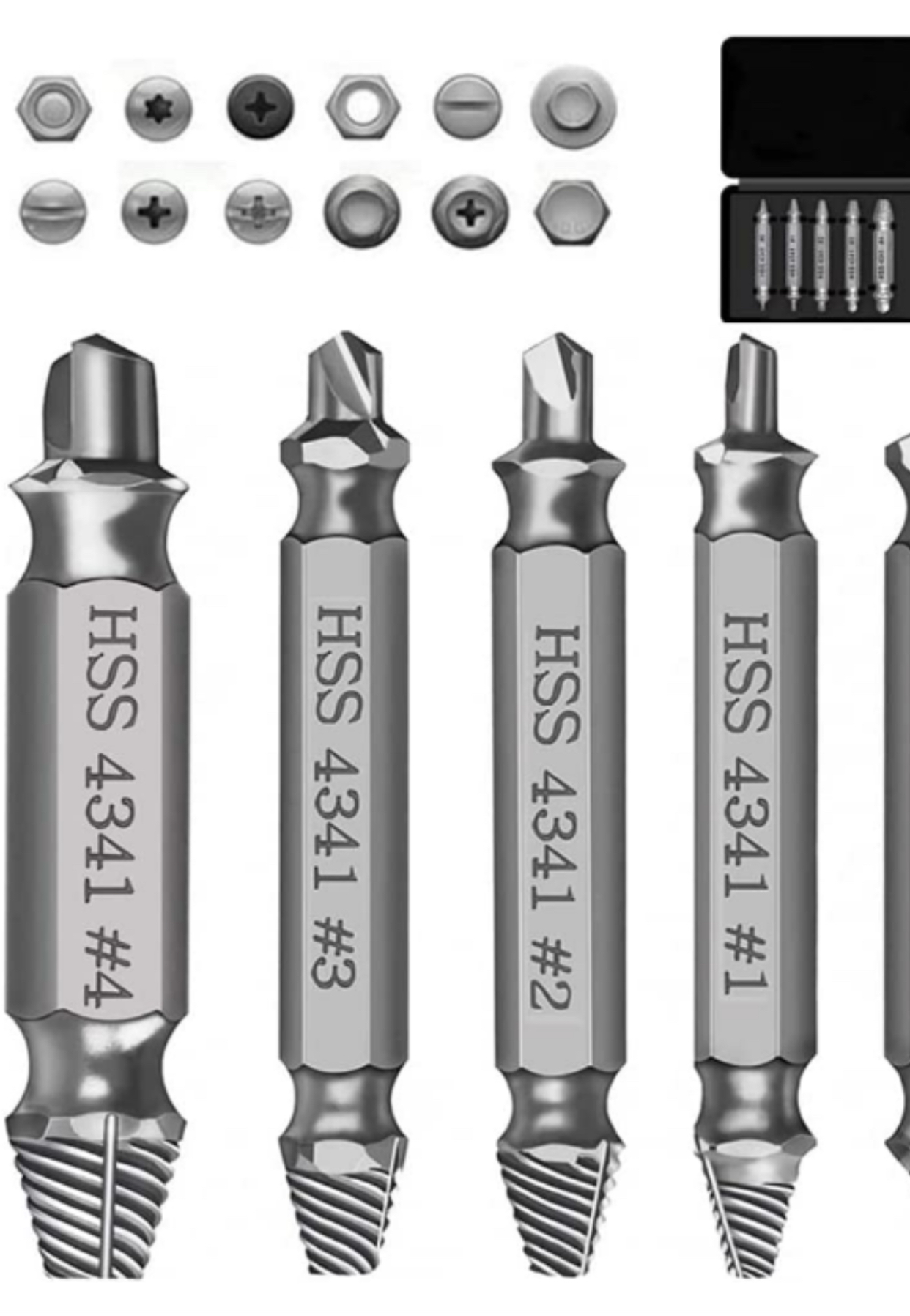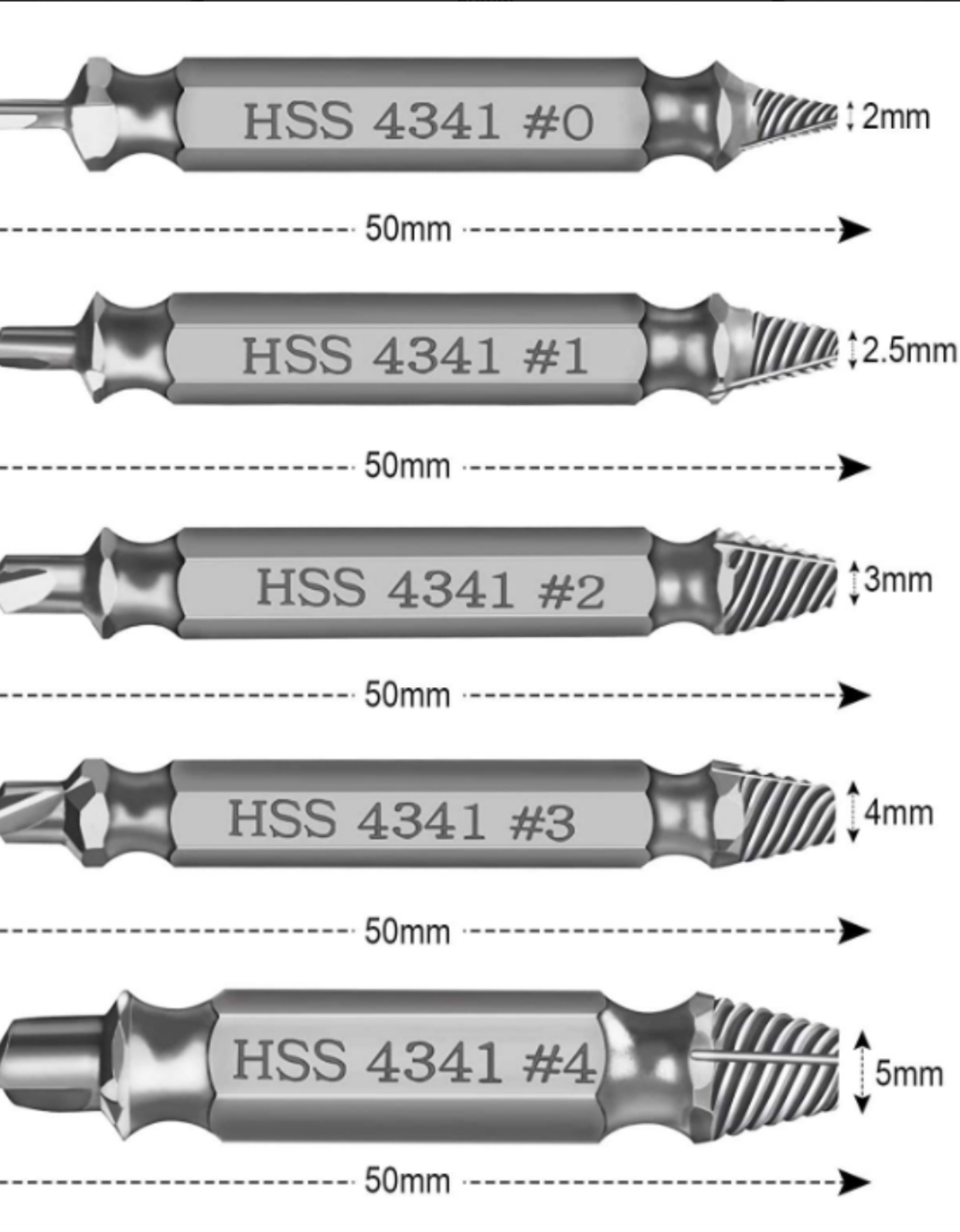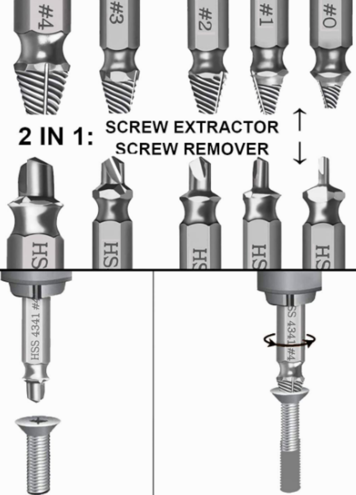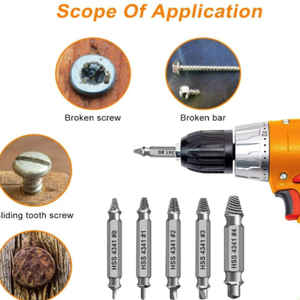 ENSEMBLE D'EXTRACTEURS DE VIS 5 PIÈCES - L'ensemble d'extracteurs de vis (#0, #1, #2, #3, #4) fonctionne avec n'importe quelle perceuse et n'importe quelle taille de vis ou de boulon. Cet extracteur de vis endommagé peut enlever toutes les tailles courantes de vis endommagées, dénudées ou cassées. Ce kit d'outils de démontage de vis endommagé est fabriqué à partir d'acier rapide HSS 4341 #, qui a une dureté élevée de 63hrc, il est durable et facile à retirer toutes les vis endommagées. FACILE À UTILISER - Deux étapes faciles, d'abord vous avez juste besoin d'une perceuse, sélectionnez un peu plus petit que la vis endommagée et commencez l'extraction en utilisant la mèche/pointe de brunissage et percez pour créer un trou propre (assurez-vous d'exécuter la perceuse dans inverser pendant le processus). Ensuite, placez le foret sur la pointe d'extraction et en utilisant une pression vers le bas constante (et une vitesse lente), laissez la pointe d'extraction "mordre" dans la vis endommagée, puis vous pourrez facilement retirer la vis. Conservez cet ensemble dans votre boîte à outils pour retirer la vis endommagée et remettre votre projet sur les rails. Parfaitement adapté à divers travaux de réparation de machines.